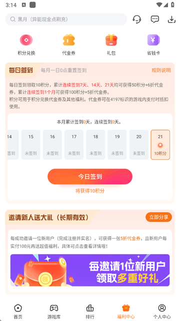 2.登录成功后首先点击签到,签到获得的金币可以换取平台币,这是个好东西来的。