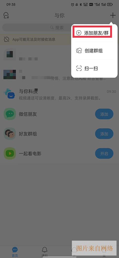 2、在下拉菜单里点击“添加朋友/群”;
